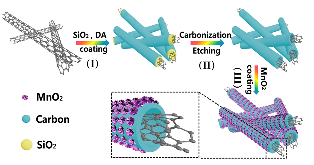 最近,公司低维材料与清洁能源创新型科技团队以碳纳米管(CNT)为基本骨架,通过模板法,以多巴胺为碳源和氮源,在模板二氧化硅的表面包覆了一层多孔碳层,最终构建出了双层中空碳管,经过冷冻干燥和水热等过程,成功制备出双层中空碳管与超薄二氧化锰片的复合材料(CNT@NCT@MnO2)。