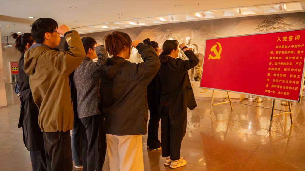 缅怀革命先烈,重温入党初心。在纪念馆宣誓厅烈士浮雕前,全体党员整齐列队,肃穆而立,表达对英烈的深切缅怀。面对鲜红的党旗,全体党员高举右拳,重温入党誓词。“我志愿加入中国共产党……随时准备为党和人民牺牲一切!”铿锵有力的誓言回荡在展厅,表达了师生党员赓续红色血脉、践行初心使命的坚定决心。