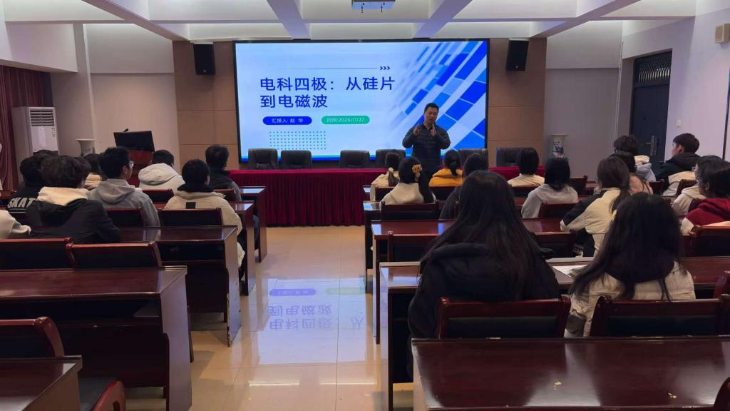1127日,公司在理科楼连廊402开展以“从硅片到电磁波”为主题的学术讲座。本次讲座邀请赵华老师主讲,2024级、2025级电子科学与技术专业全体员工参加。