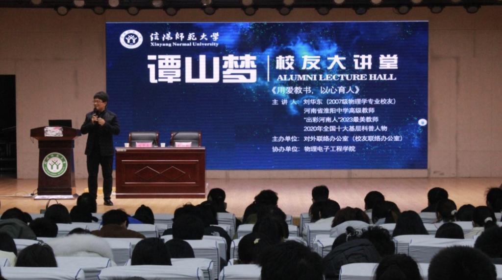刘华东以《用爱教书,以心育人》为题,从个人学习经历出发,分享着自己教书育人的幸福,并把这份幸福传递。刘华东回忆起在信阳市八一小学支教的经历,鼓励同学们要保持对教育事业的热爱,坚定从教信念。