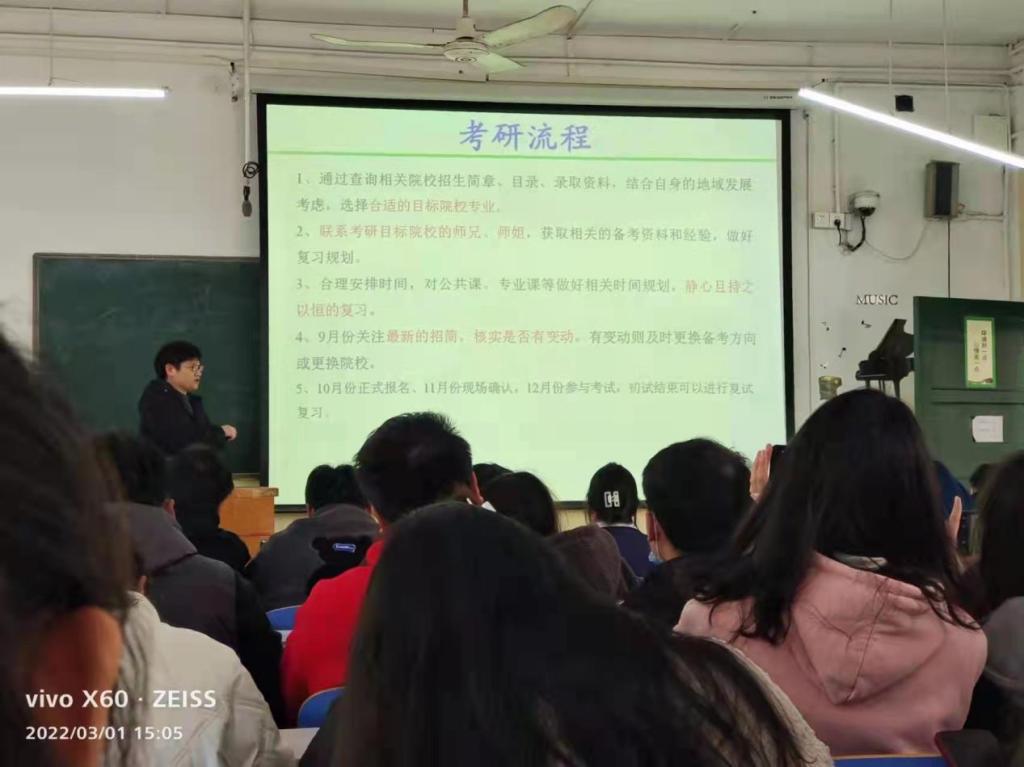 3月10日晚上,陈新武为电子信息工程和电子科学与技术两个专业的员工作考研指导。他阐述了考研的目的和意义,鼓励员工明确考研目标,合理规划人生。他通过分析电子专业考研的特点,帮助员工认清当前考研形势,注重考研时间的合理分配,并结合个人考研经历和亲身经验,为员工提供可借鉴的方法,激发员工的考研热情。