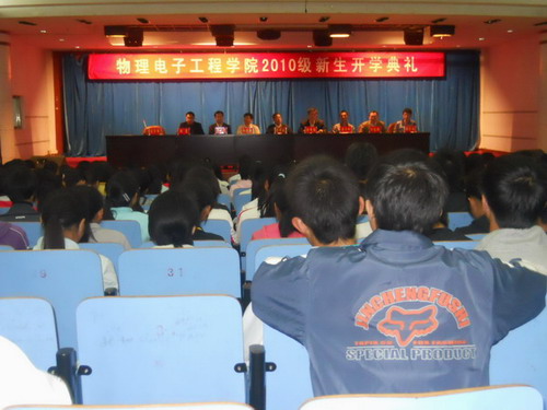 9月24日晚,物电公司2010级新生开学典礼在理科楼报告厅隆重举行,报告厅内灯火辉煌、座无虚席、掌声雷动。公司党总支书记雷前友、经理余本海、副经理孙宜海、党总支副书记苗天峰、副经理罗永松、主管教学的涂友超博士以及2010级辅导员和全体新生共同参加了典礼。典礼由党总支副书记苗天峰主持。