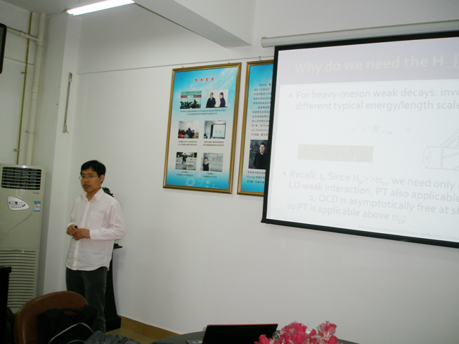 报告中,李新强博士从“为什么要计算有效哈密顿、相关计算的理论工具及理论背景、流流算符的简单例子、目前威尔逊系数的计算现状”五个方面展开,娓娓道来,详细介绍了重味物理有效哈密顿及威尔逊系数的计算方法及目前计算的现状,最后李新强博士举例介绍了树突过程、圈图过程以及B介子混合中哈密顿及威尔逊系数的计算。报告会后李新强博士还耐心的回答了在座的老师和研究生们的的提问,并与该院师生就当前重味物理中的一些具体问题进行了具体的讨论。