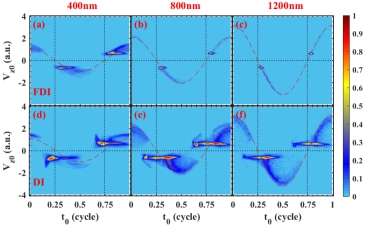 图2:沿激光偏振方向的电离-出口速度(VZ0)与电离时间(t0)的关系。FDI事件中被俘获电子(上行)。DI事件中第二个发射的电子(下行)。激光的波长分别为400 nm(左),800 nm(中)和1200 nm(右)。图中的红色虚线曲线显示矢势。