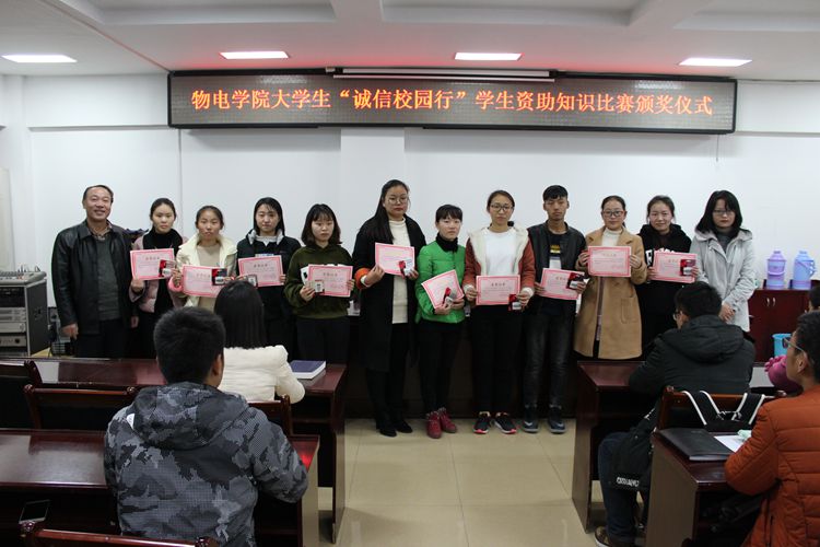 经评审人员认真批改,按分数高低选出一、二等奖和优秀奖。11月27日下午,此次选拔大赛颁奖仪式于理科楼511会议室隆重举行。公司党委书记柳士刚,团委老师黄钰莹莅临现场,与获奖学子一同参加仪式。柳士刚宣布本次比赛的获奖名单。他对学子们考试期间的优秀表现和取得的优异成绩表示肯定与衷心的祝贺。他谈道,公司历来重视员工资助管理工作,紧密围绕《河南省高校员工资助手册》开展了系列教育宣讲活动,希望同学们认真学习相关知识,遵守校规校纪,做诚实守信的物电人代表。在场领导老师亲自为学子们颁发奖品和荣誉证书,并合影留念。最后,颁奖仪式在大家热烈的掌声中圆满结束。