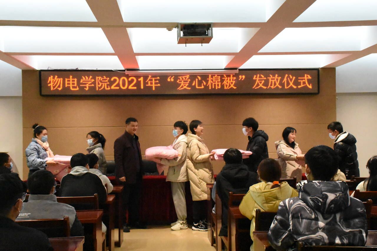 仪式开始,刘百超发表讲话,对学子们予以亲切的关心,表示公司各领导老师切实关注学子们的生活学习状况,并提供真情帮助,用厚实棉被温暖学子们。接着,刘百超向在场员工提三点希望,一是注意疫情防控,严格遵守公司的规章制度,支持公司的疫情防控工作,提高安全意识。二是作为新时代的老员工,要积极主动地抓住学习机会,以端正的态度、饱满的热情投入到日常学习工作中去。三是培养感恩之心,传承奉献精神,积极培养诚信友善、乐于助人的品格,传承中华民族传统美德,关爱别人,奉献社会。最后,刘百超带领各位老师为学子们发放被褥,并就生活学习问题与学子们进行亲切简短的交谈。学子们深受感动鼓舞,纷纷表示一定会刻苦学习,不负领导老师的期望,提高自身专业水平,为建设高水平师范大学贡献自己的力量。
