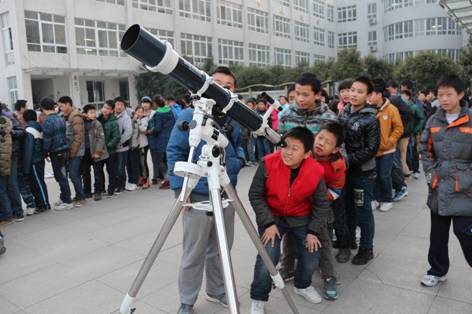 一来到羊山中学,协会成员就受到了羊山中学领导、老师的热情接待。此次活动双方都十分重视,为此,协会带来了反射式天文望远镜和折射式天文望远镜各一台,同时,带来了许多关于天文观测知识的宣传板。望远镜调试完毕,随着夜幕的降临,望远镜后很快就排起了长长的队伍。随后,羊